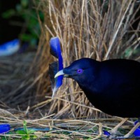 Wiki: «La característica más notable de los miembros de Ptilonorhynchidae es comportamiento extrordinariamente complejo de los machos, al construir unemparrado o gabinete para atraer la...
