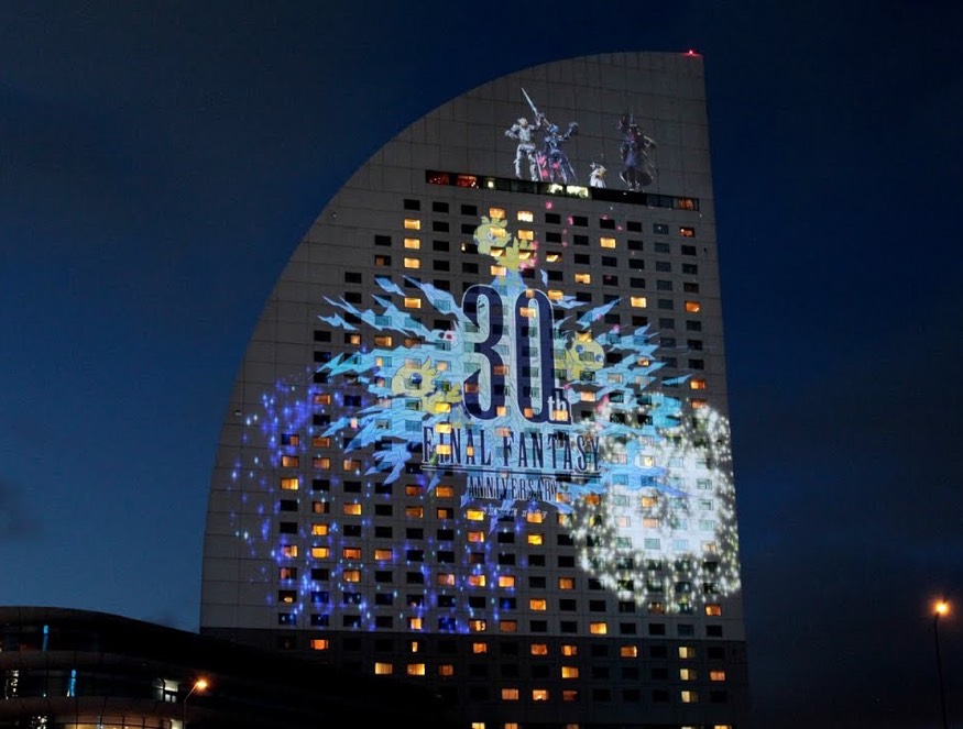 Con motivo del 30 aniversario del videojuego Final Fantasy (y el lanzamiento de su última entrega, la XIV), Esquare Enix hizo un espectáculo de proyección mapeada sobre el ‘InterContinental Yokohoma Grand hotel’.