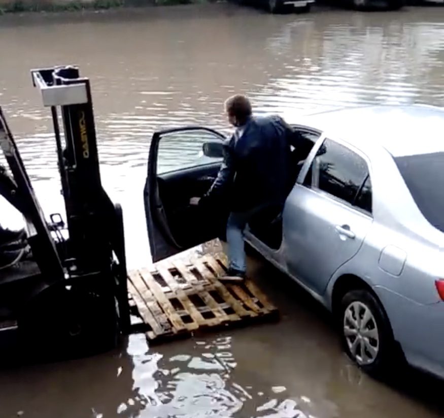 Tras una fuerte lluvia y las calles estaban inundadas y la gente no podia llegar a sus coches. Menos mal que estos rusos tienen soluciones para todo.