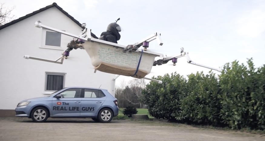 Un sueño, todo tiene un principio. No es un coche volador, es un dron gigante acoplado a una bañera con el que puedes ir al super…
